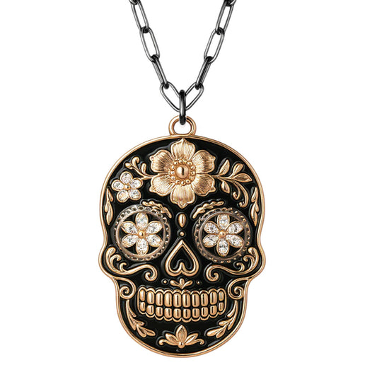 925 Sterling Silver Black & Yellow Gold Sugar Skull Pendant Necklace