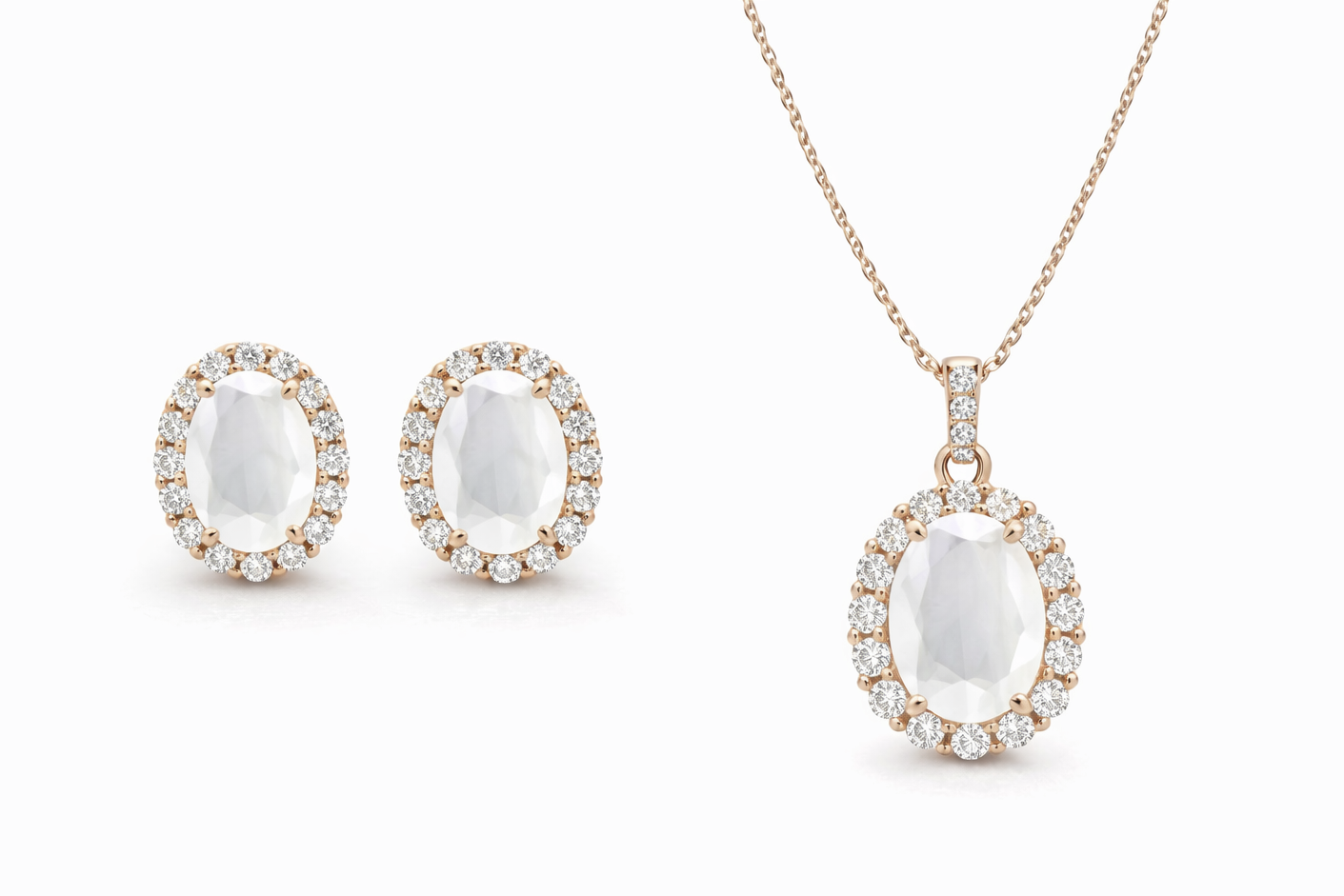Oval Cut Milky White Crystal Neclace & Earrings Jewelry Set (Choose your plating)