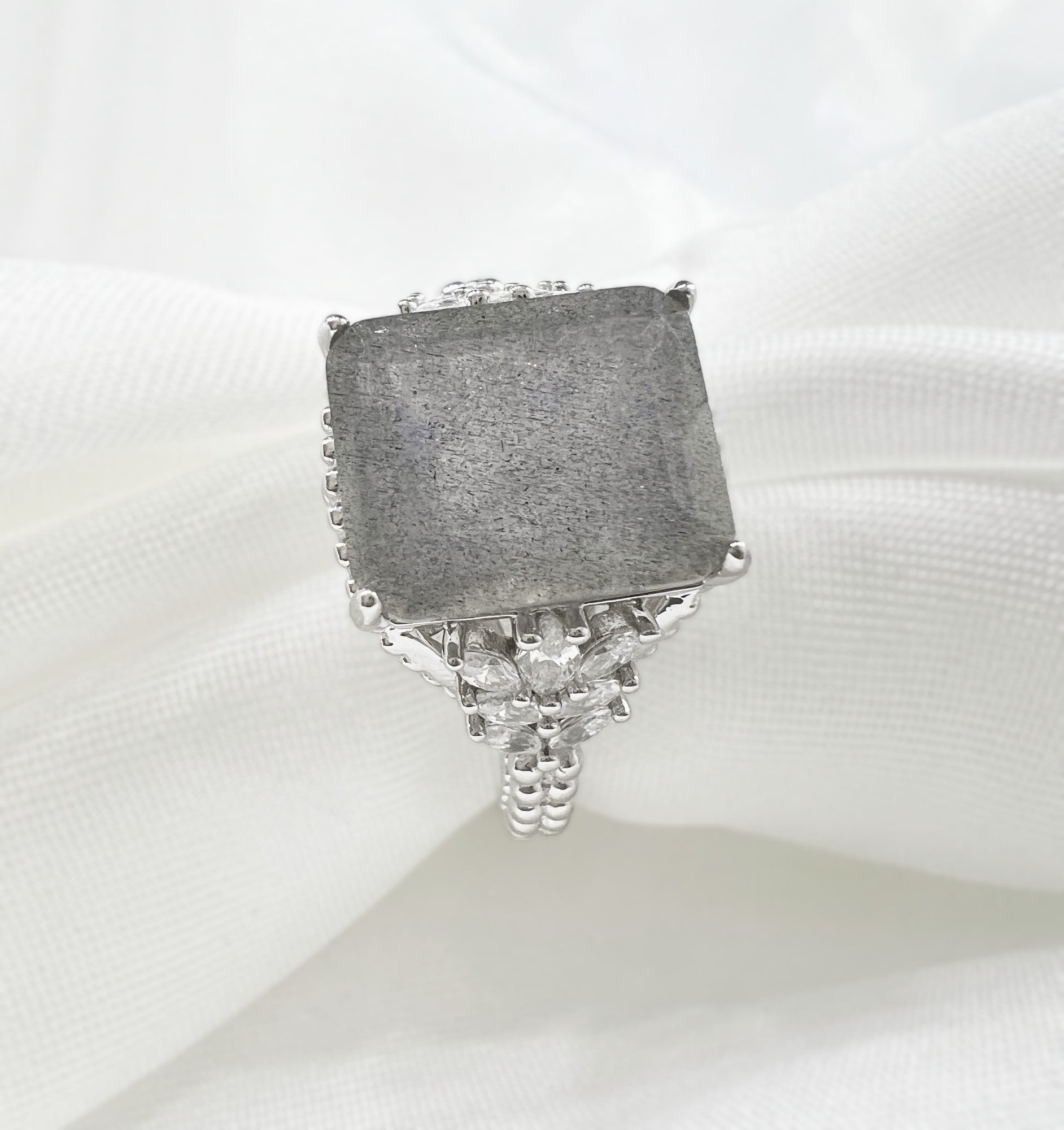 💎 Center Stone Size: 12 x 10mm                                         💎 Center Stone Shape: Rectangle                                         💎 Side Stone Shape: Marquise                         Â