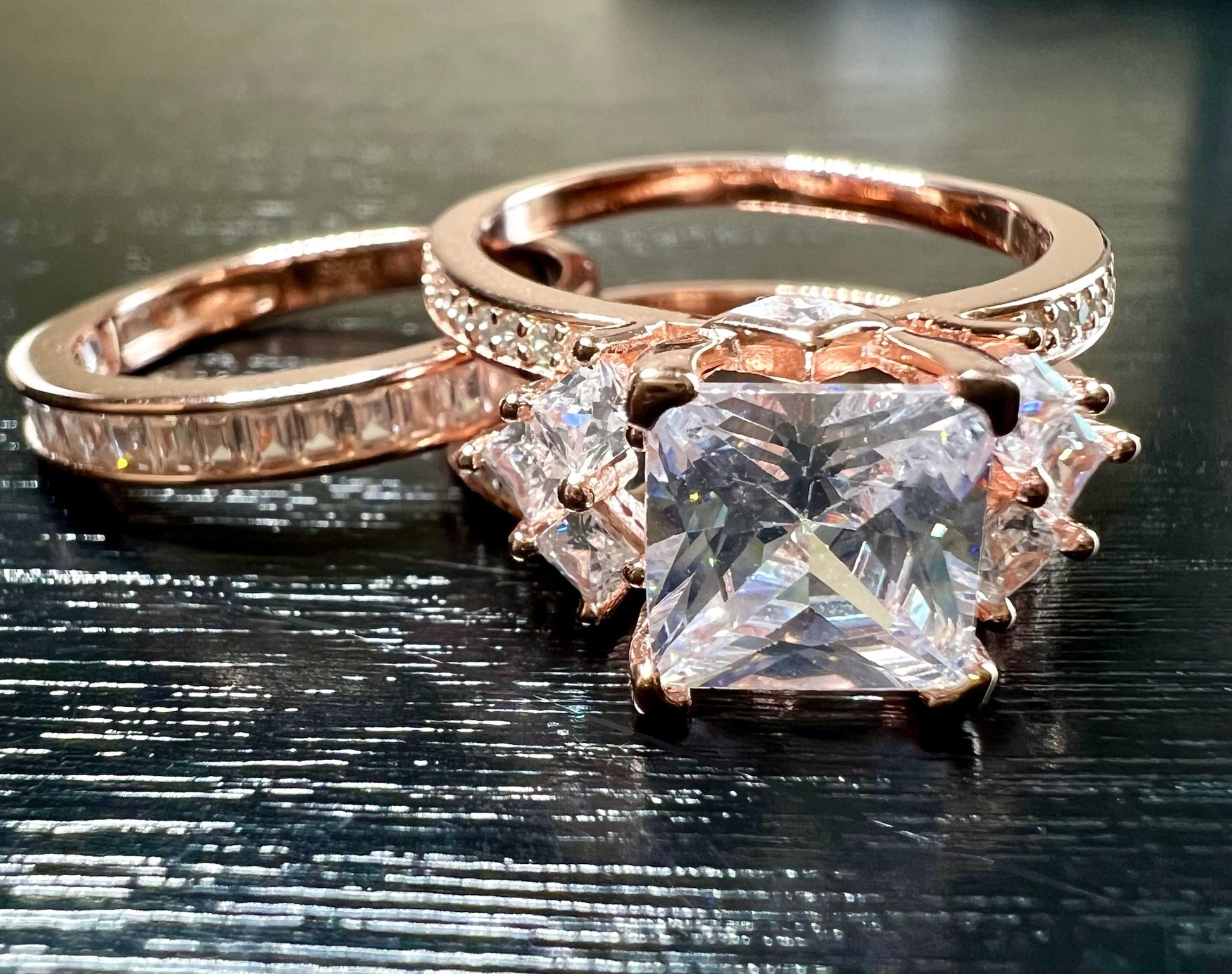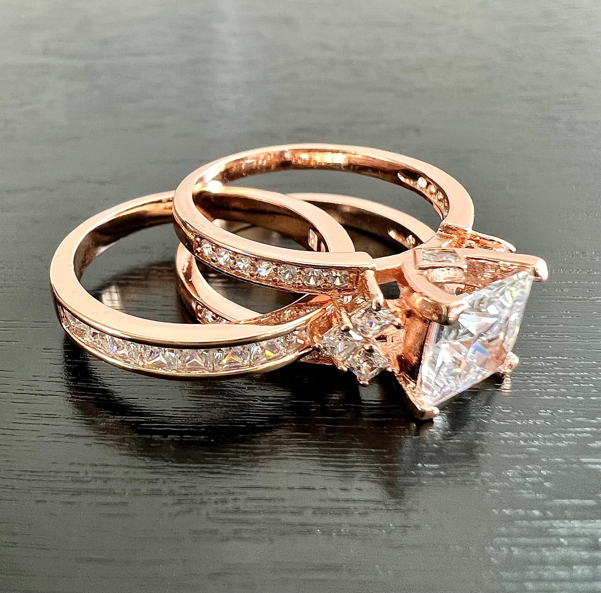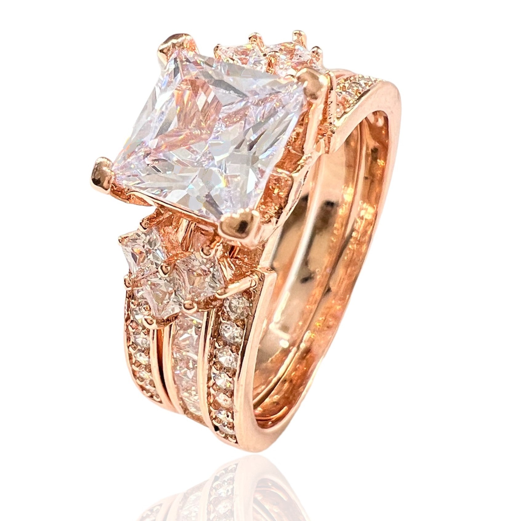 925 Sterling Silver Princess Cut, Diamond CZ Tri Band Ring on Rose Gold