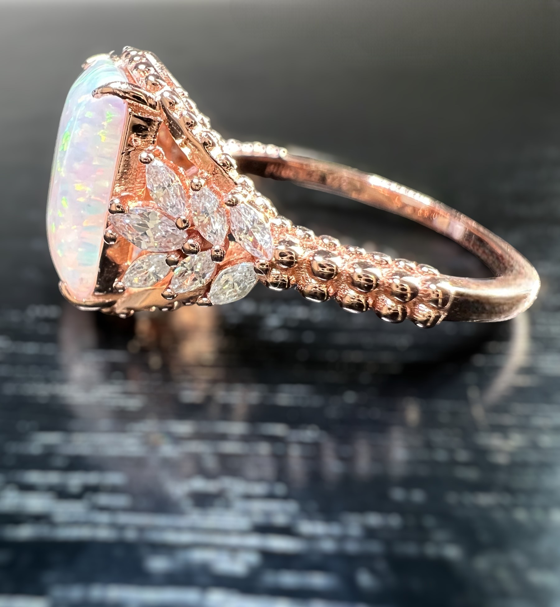 White Fire Opal & CZ Beaded Shank 925 Sterling Silver Ring - Rose Gold